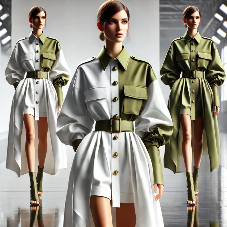 - Look 2: Bol ve oversized formda, düz hatlara sahip, yeşil panel detayları ve yırtmaçlı kesim.