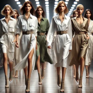 - Look 1: Fit kesimli, kısa asimetrik gömlek elbise. Yeşil yaka ve manşet detayları, altın düğmelerle tamamlanmış.